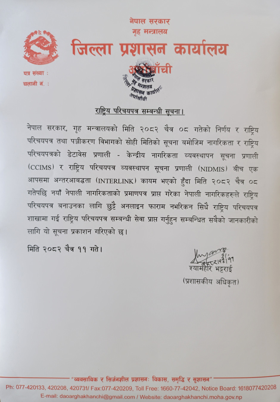 राष्ट्रिय परिचयपत्र सम्बन्धी सूचना।