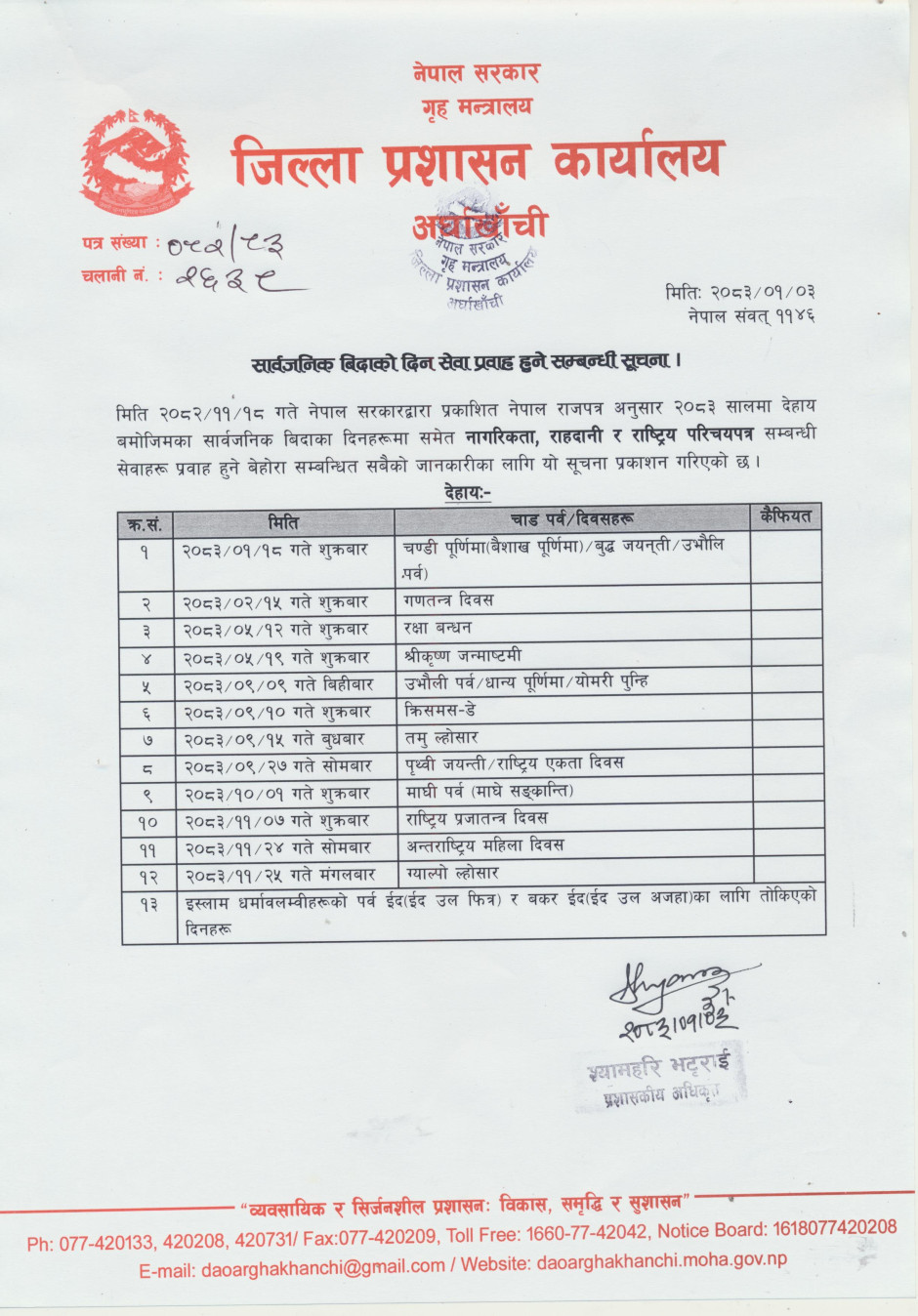 सार्वजनिक बिदा सम्बन्धी सूचना!